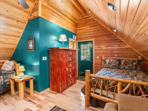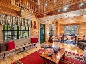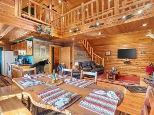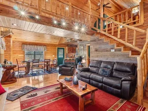 The main-level primary suite ensures convenience and comfort, making the cabin ideal for both full-time living and easy weekend stays.