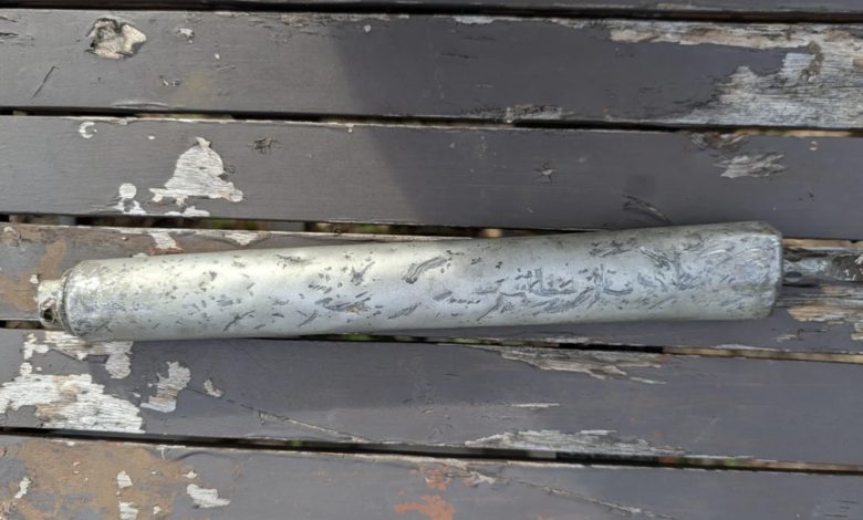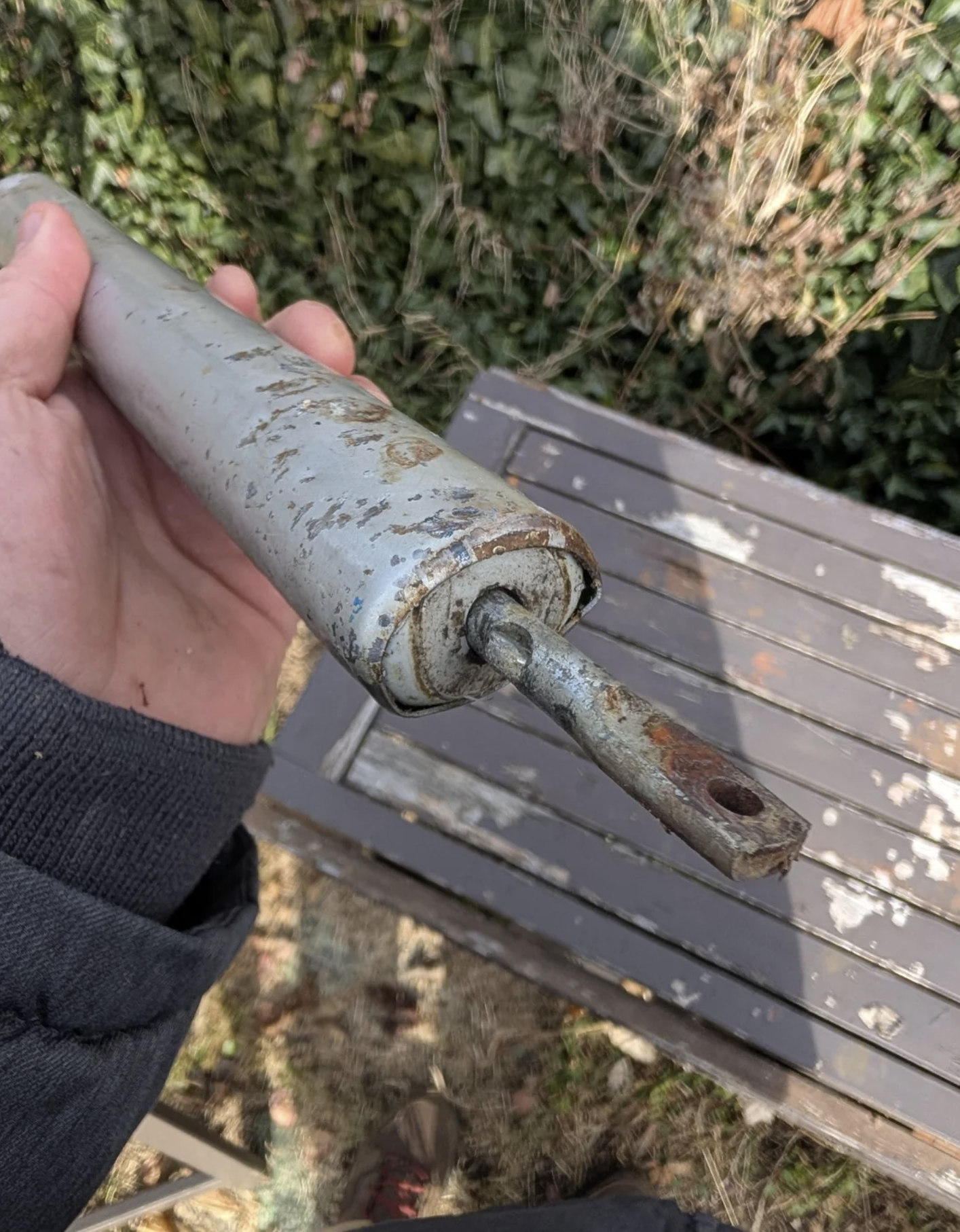 I noticed something shiny in the drive way, it was a 1-1/2 feet long, about 6 inch diameter metal cylinder with a mounting hole at one end, a piston rod (with a bracket) at the other, a few scratches and some rusty streaks at the base.
