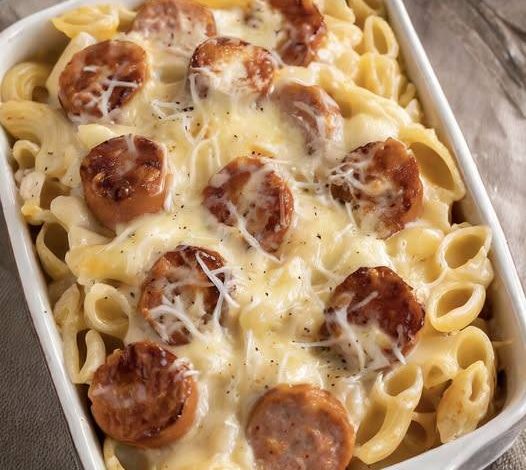 Step 5: First Layering Sequence: In the baking dish, begin the tantalizing layering process: spread half of the cooked penne pasta, followed by the 16 oz jar of rinsed and well-drained sauerkraut, then half of the sliced kielbasa, and half of the 3 cups of grated Swiss cheese. Drizzle the layers with half of the prepared sauce.