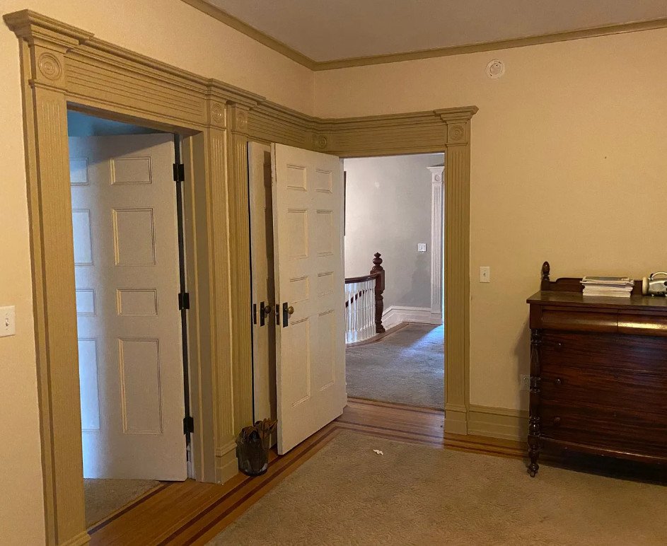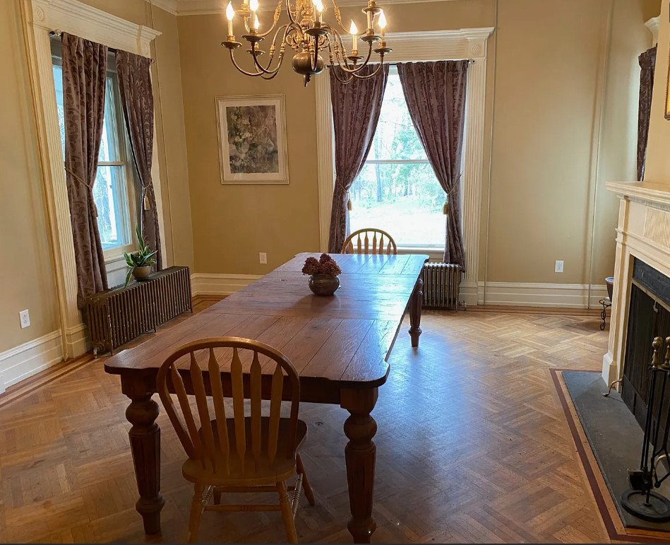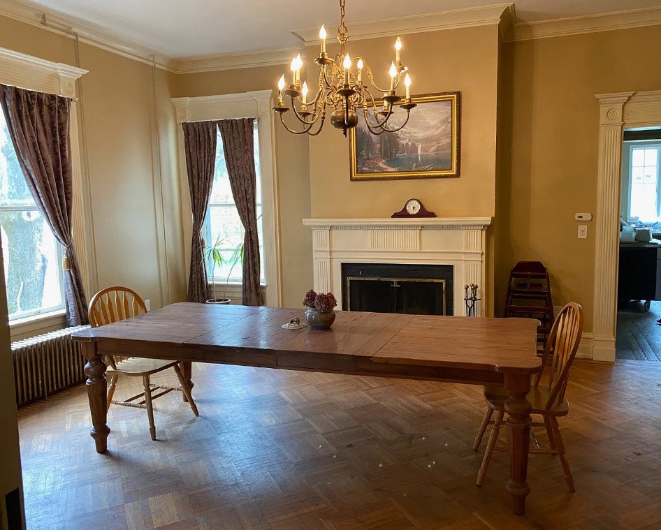 The main floor features a gracious parlor anchored by a fireplace—an inviting space for conversation or quiet reflection. The formal dining room, illuminated by a grand chandelier, evokes the luxury of formal entertaining that once defined upper-class life in the early 1900s. Nearby, a music room offers the perfect setting for a grand piano, a nod to the cultural refinement that the Gilded Age elite so prized. Each room flows naturally to the next, creating a seamless sense of space and continuity that encourages both intimate gatherings and larger social occasions.
