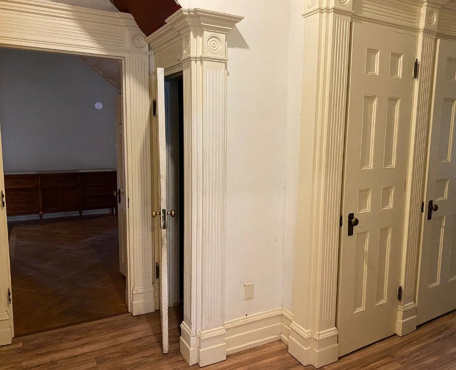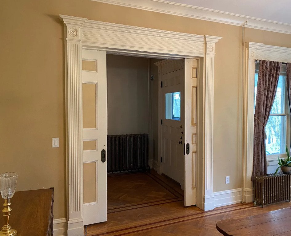 Stepping inside the Collis P. Huntington House is like walking through history. The home’s interior is a celebration of early 20th-century artistry. Parquet floors with intricate wood inlays, ornate crown mouldings, and wide baseboards recall a time when craftsmanship was both a profession and a passion. Beautifully carved window casements frame views of the surrounding landscape, while original pocket doors and built-ins provide both charm and practicality.